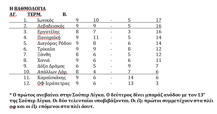 Στην κορυφή της βαθμολογίας παρέμεινε ο Ιωνικός, παρά την ήττα του στην Δράμα (2-1) από την Δόξα. Η ομάδα της Νίκαιας προερχόταν από τέσσερις συνεχόμενες νίκες, αλλά οι «Μαυραετοί» του Θανάση Κολιτσιδάκη πραγματοποιούν υψηλές πτήσεις το τελευταίο διάστημα και το επιβεβαίωσαν κόντρα στους πρωτοπόρους.