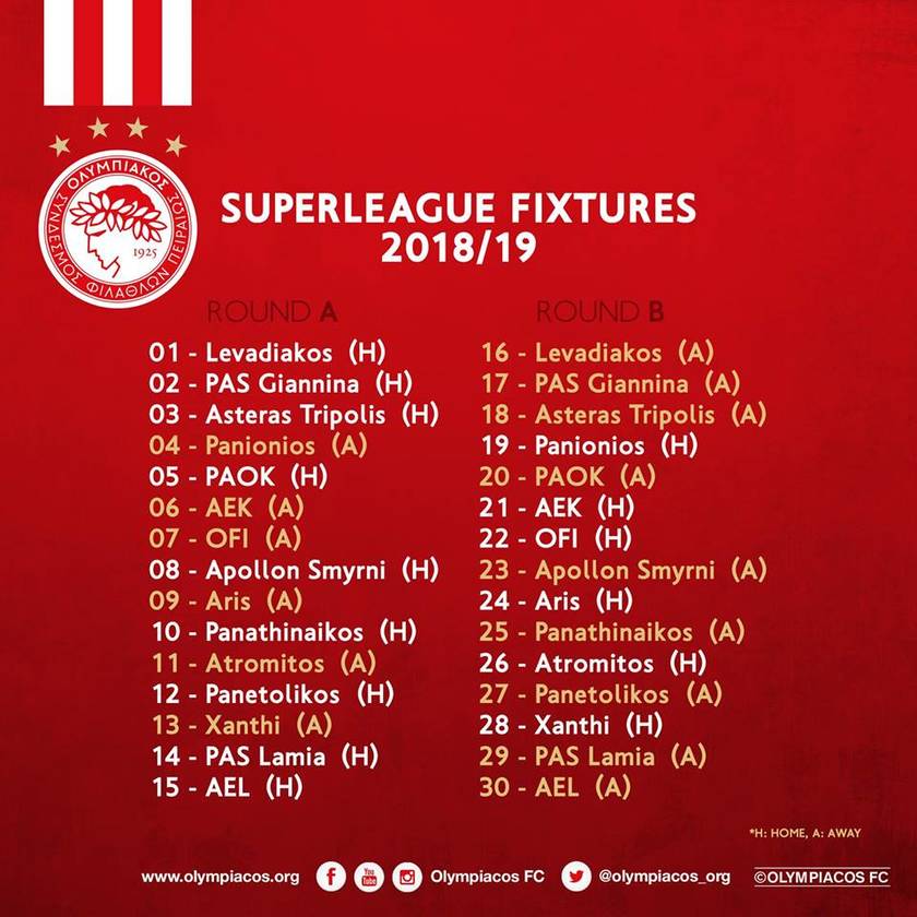 Οι «ερυθρόλευκοι» ξεκινάνε με τρία εντός έδρας παιχνίδια για πρώτη φορά στα χρονικά. Δεν ξανάγινε , ο Ολυμπιακός θα παίξει 3 συνεχόμενα εντός έδρας ματς και θα αγωνισθεί 9 φορές στο Καραϊσκάκης στον πρώτο γύρο.