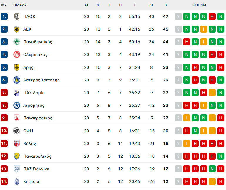 Ο ΠΑΟΚ ήταν ο μεγάλος νικητής στο ντέρμπι της 20ής αγωνιστικής της Super League 1 κόντρα στον Παναθηναϊκό και έμεινε μόνος στην κορυφή της κατάταξης με 47 βαθμούς, αφήνοντας στην 3η θέση τον Παναθηναϊκό.