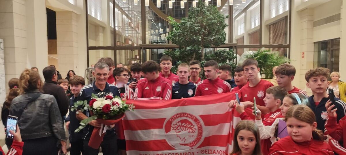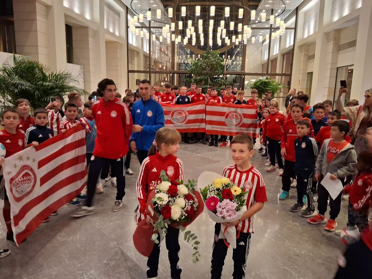 Παιδιά από τη σχολή ποδοσφαίρου Θεσσαλονίκης υποδέχτηκαν την αποστολή του Ολυμπιακού.