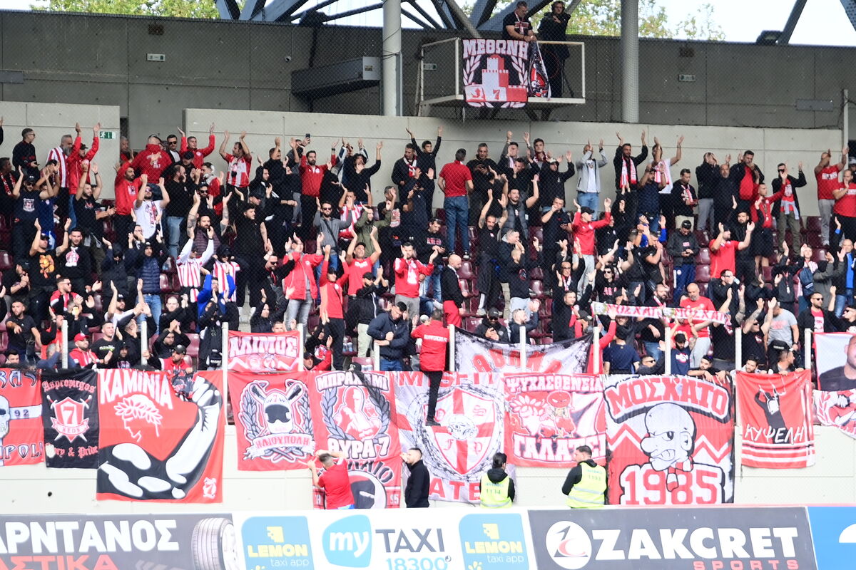 Οι οπαδοί του Ολυμπιακού έχουν πάρει τις θέσεις τους στο AEL FC ARENA για το παιχνίδι με την ΑΕΛ.