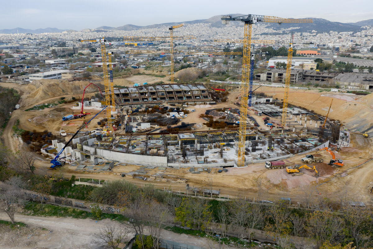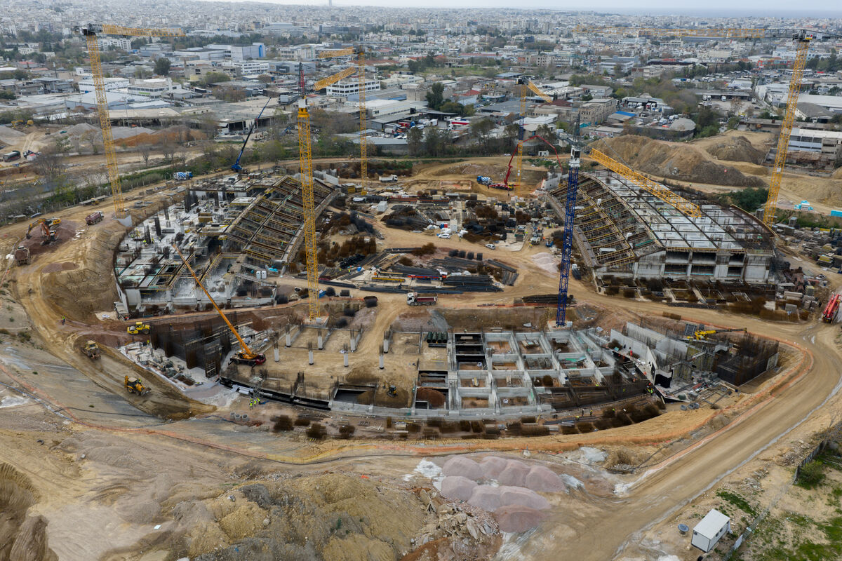 Συγκεκριμένα, έχουν ήδη σχηματοποιηθεί οι εξέδρες στις δύο πλευρές του γηπέδου και παράλληλα προχωρούν οι εργασίες στο ένα από τα δύο πέταλα. Στο εργοτάξιο, όπως φαίνεται και από τις παρακάτω φωτογραφίες δουλεύουν τουλάχιστον έξι γερανοί.
