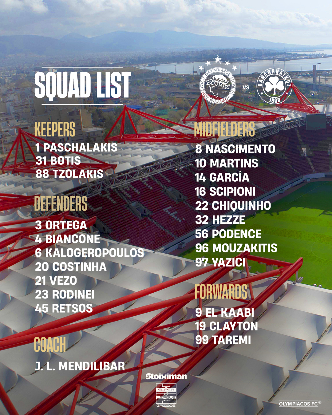 Με τον Ελ Κααμπί, αλλά χωρίς Πιρόλα, Αντρέ Λουίς και Μπρούνο η αποστολή του Ολυμπιακού για το ντέρμπι με τον Παναθηναϊκό.