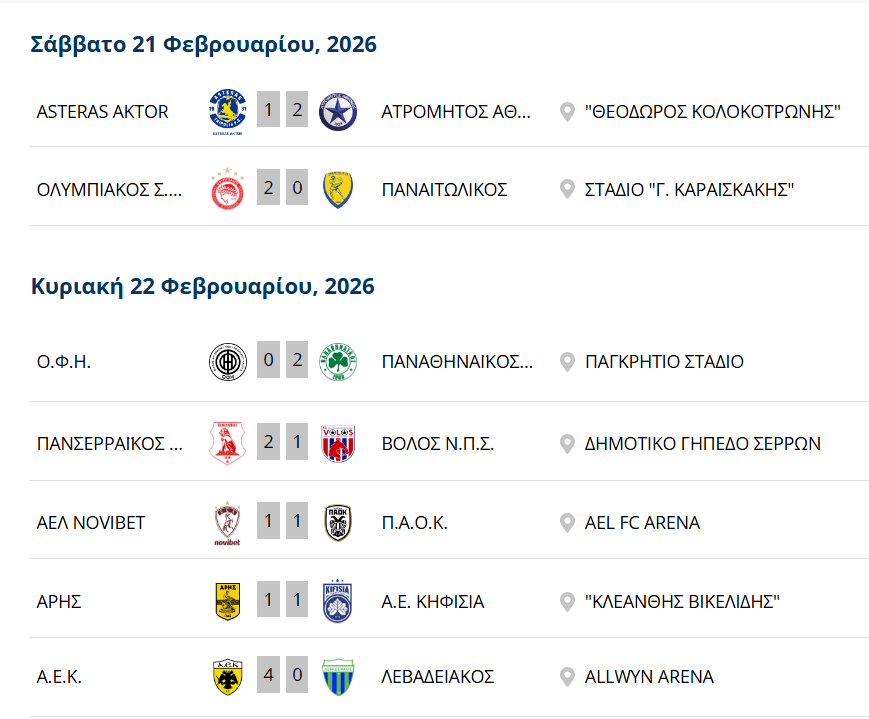 Ολοκληρώθηκε η δράση της 22ης αγωνιστικής της Super League, με την ΑΕΚ να νικά τον Λεβαδειακό με 4-0 και να βρίσκεται μόνη στην κορυφή.