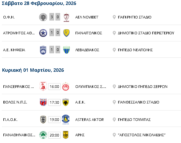 Η 23η αγωνιστική του πρωταθλήματος ολοκληρώνεται με τη διεξαγωγή των τεσσάρων υπολειπόμενων αναμετρήσεων. Το πρόγραμμα ξεκινάει στις 16.00 με τον Πανσερραϊκό να υποδέχεται τον Ολυμπιακό. Η νίκη επί του Βόλου έδωσε νέες ελπίδες στο σύνολο του Ζεράρ Σαραγόσα για παραμονή, αλλά πρέπει να διανύσει πολύ δρόμο ακόμα. Επιστροφή στις νίκες για τους «ερυθρόλευκους» κόντρα στον Παναιτωλικό, που θα τα δώσουν όλα για το πρωτάθλημα.