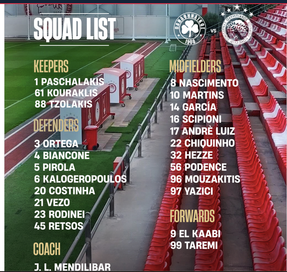 Από τον Ολυμπιακό ανακοινώθηκε η αποστολή για το ντέρμπι με τον Παναθηναϊκό (19/04, 21:00), στο πλαίσιο της 2ης αγωνιστικής των playoffs της Super League. Οι Μπρούνο και Κλέιτον «κόπηκαν» λόγω του κανονισμού για τους μη κοινοτικούς