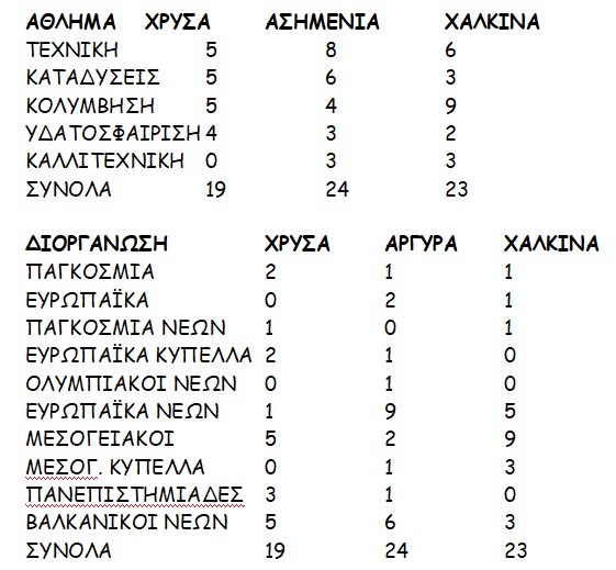 Από εκεί και πέρα, σε Εθνικό επίπεδο είχαμε μεγάλες επιτυχίες. Τέσσερα (4) μετάλλια σε Παγκόσμια πρωταθλήματα ανδρών - γυναικών, τρία (3) σε αντίστοιχα Ευρωπαϊκά πρωταθλήματα, δύο (2) σε Παγκόσμια πρωταθλήματα νέων, από ένα (1) σε Ευρωπαϊκά Κύπελλα και Ολυμπιακούς Αγώνες Νέων, 15 σε Ευρωπαϊκά πρωταθλήματα νέων, 16 σε Μεσογειακούς Αγώνες και άλλα τέσσερα (4) σε Μεσογειακά Κύπελλα και Πανεπιστημιάδες, 14 σε Βαλκανικούς αγώνες νέων, συνιστούν το εντυπωσιακό και φέτος παλμαρέ των διακρίσεων.