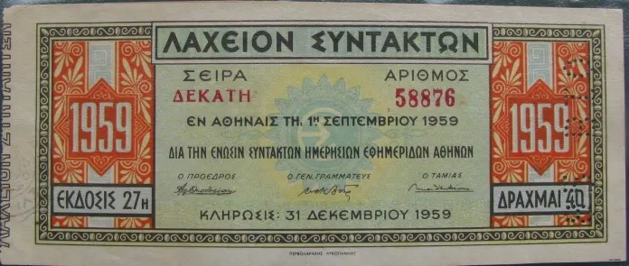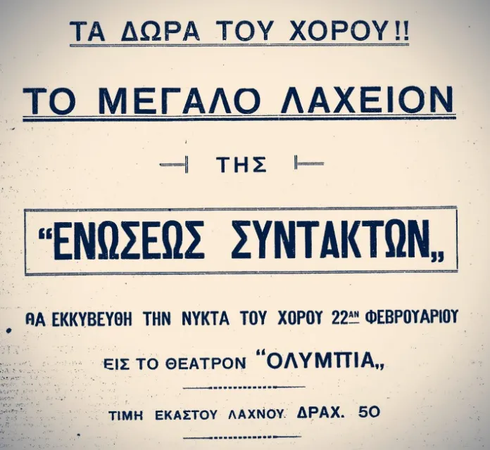 Το πρωτοχρονιάτικο λαχείο εκδιδόταν από την Ένωση Συντακτών, κυκλοφόρησε για πρώτη φορά το 1927, την δεκαετία του ’60 μοίραζε πολυκατοικίες και καταργήθηκε, έγινε κρατικό επί Χούντας.