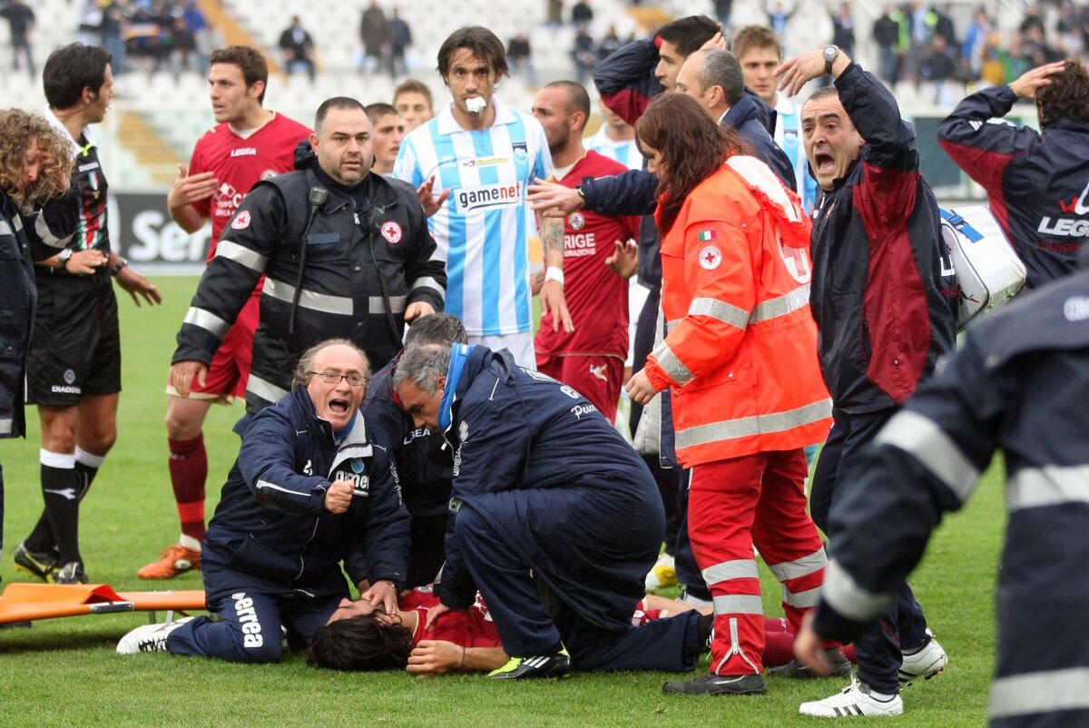 Ο μέσος της Λιβόρνο έπεσε ξαφνικά στο χορτάρι προδομένος από την καρδιά του. Αμέσως οι γιατροί έτρεξαν προς το μέρος του προκειμένου να του προσφέρουν τις πρώτες βοήθειες. Χάρη στη χρησιμοποίηση απινιδωτή ο 25χρονος Ιταλός ανέκτησε προσωρινά τις αισθήσεις του, αλλά στη συνέχεια εξέπνευσε εντός του ασθενοφόρου που τον παρέλαβε.
