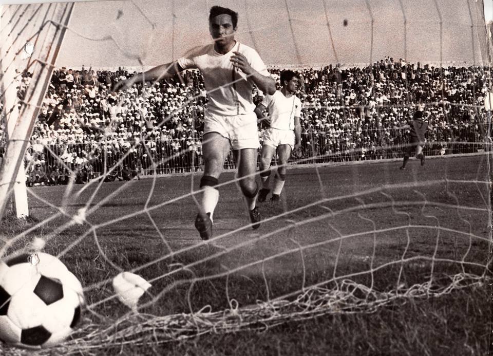 Ο Αριστείδης Καμάρας πηγαίνει να μαζέψει τη μπάλα από τα δίχτυα του, ενώ ο Χάιτας (στο βάθος με το Νο 7), τρέχει προς την κερκίδα των Πανιώνιων.